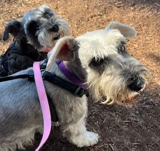 Sophie and Maggie are both 8½ year old Salt & Peppers females who came to us together but can be adopted separately by someone with another dog. They are both very sweet girls, housebroken and healthy, and they can walk nicely on a lead once they settle down. |